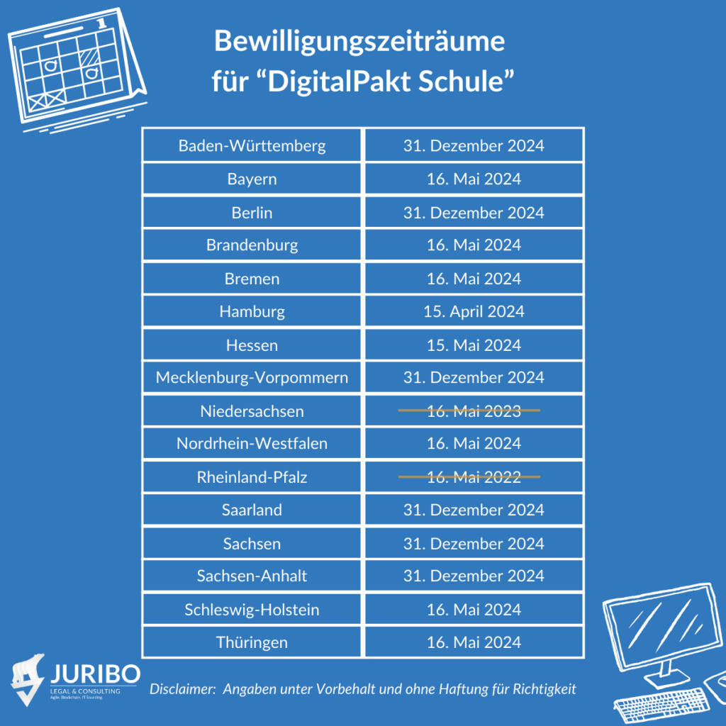 Ob die Schulträger den DigitalPakt noch in Anspruch nehmen können, können Sie den nachfolgenden Bewilligungsfristen entnehmen oder über die Seite des BMBF nachlesen: